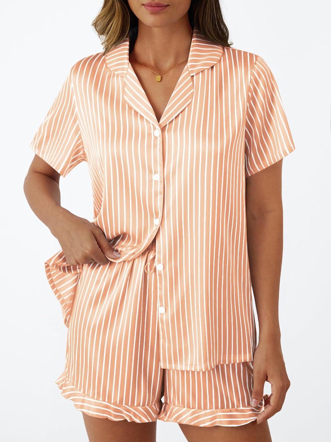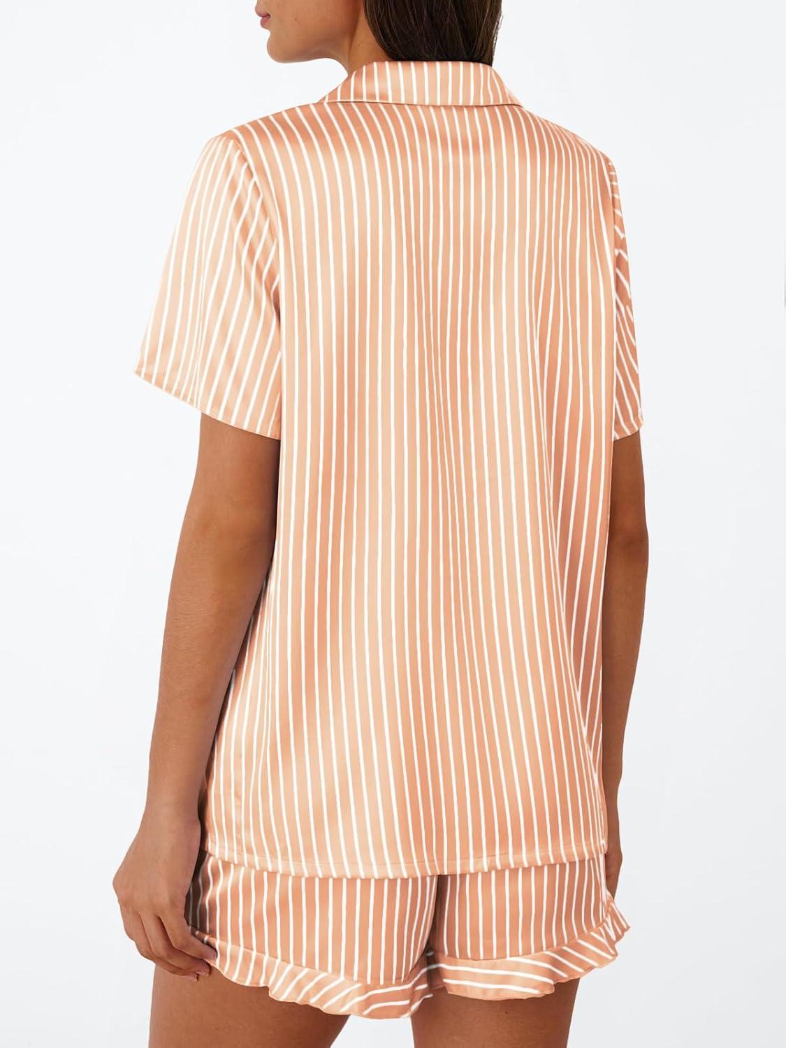 LILLUSORY Graphic Satin Pajamas for Women Set 2 Piece Ruffle Pjs Matching Lounge Party Button Down Sleepwear Silk Nightwear(Stripedchampagne)