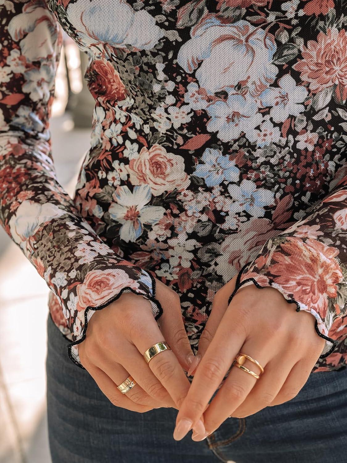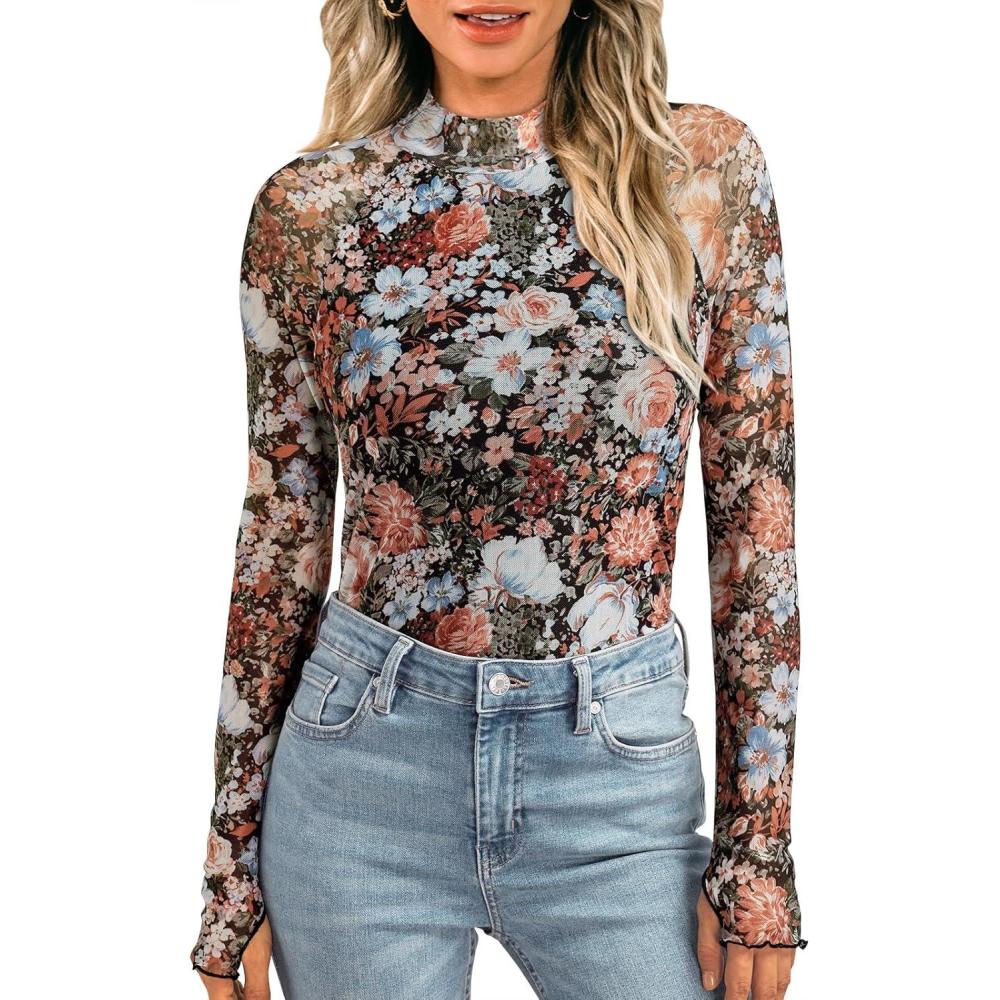 LILLUSORY Lace Long Sleeve Floral Mesh Mockneck Going Out Tops for Women Spring Fashion 2025(Floralfierce)