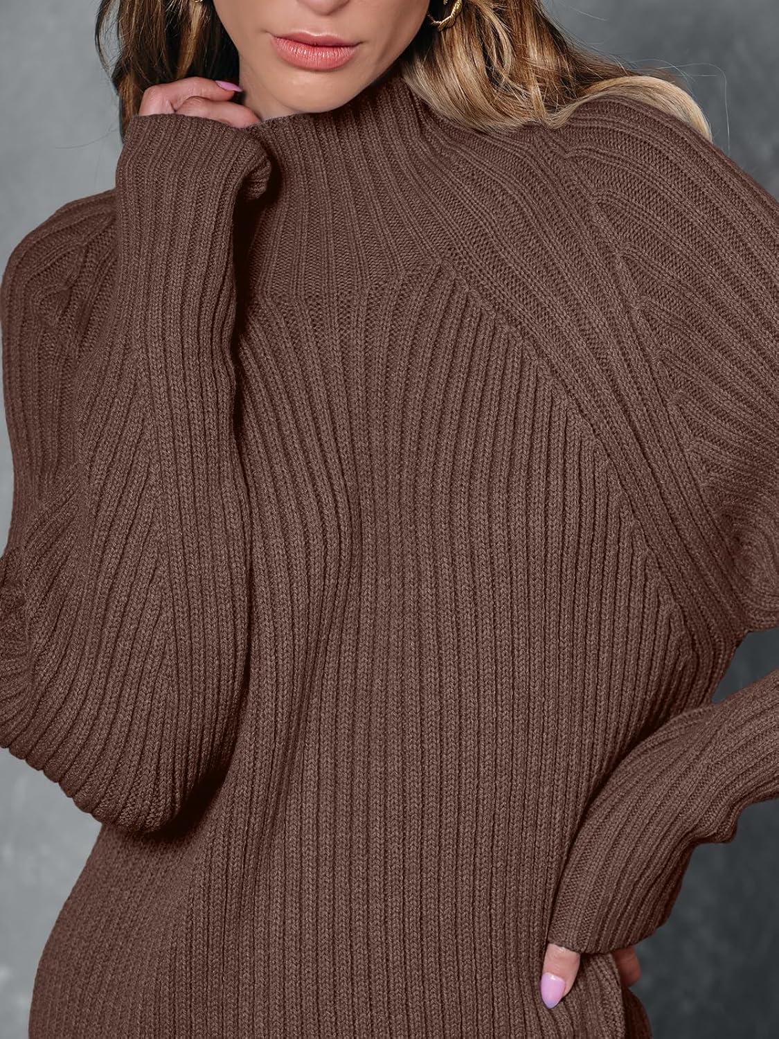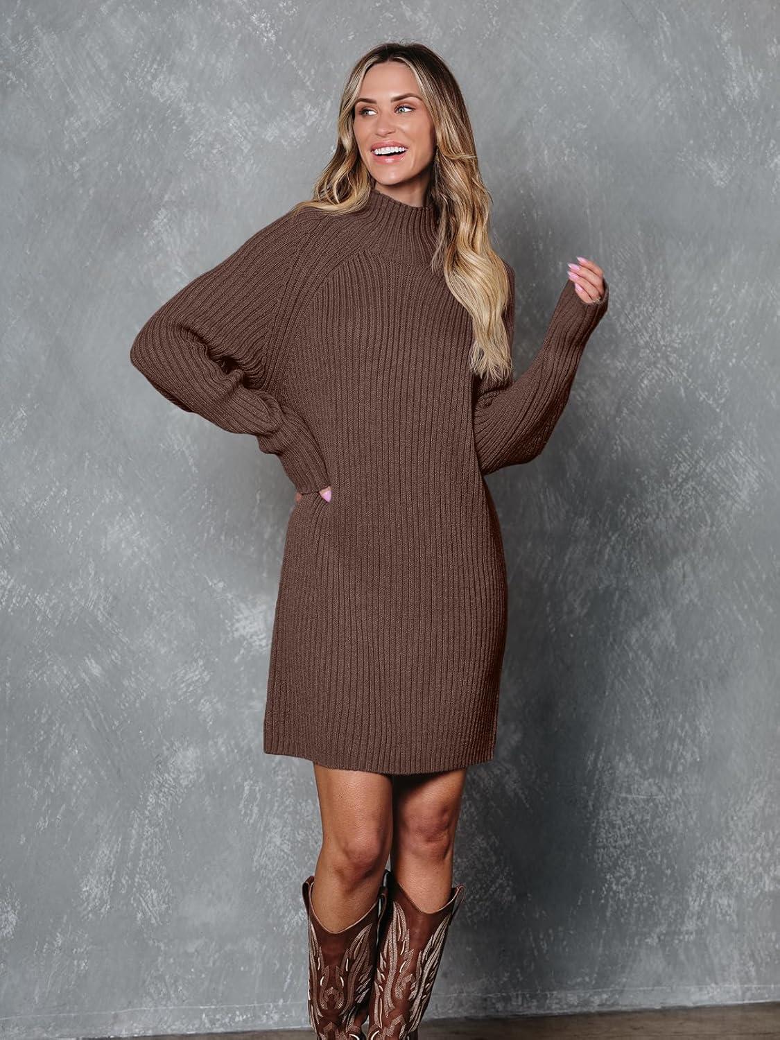 LILLUSORY Sweater Dresses for Women 2025 Fall Fashion Mock Neck Long Lantern Sleeve Oversized Outfits Knit Tops Clothes(Brown)