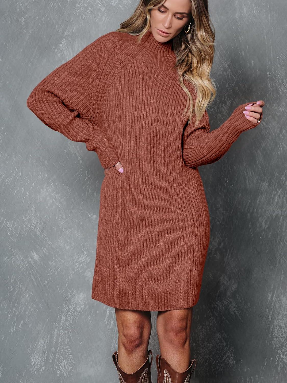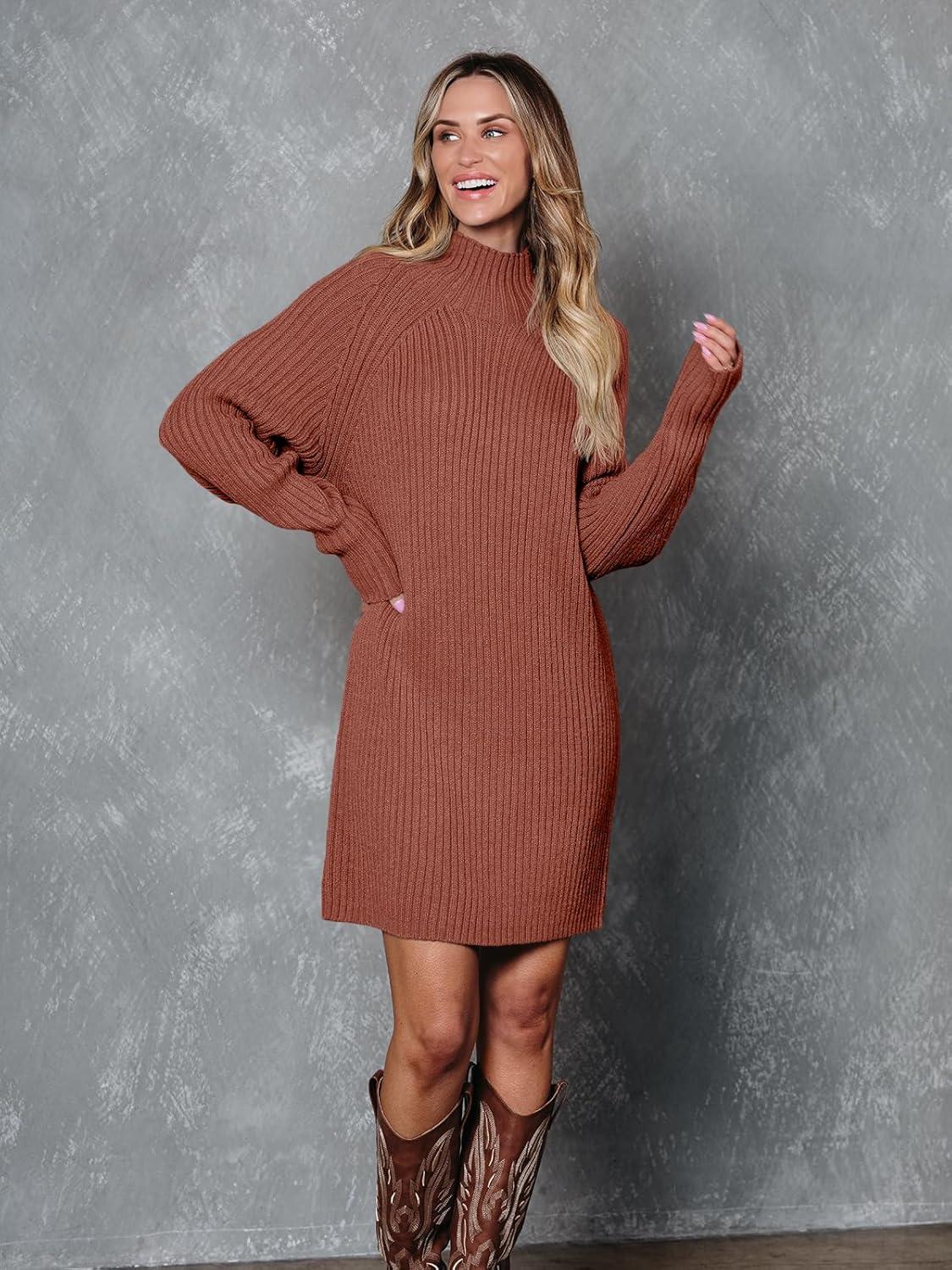 LILLUSORY Sweater Dresses for Women 2025 Fall Fashion Mock Neck Long Lantern Sleeve Oversized Outfits Knit Tops Clothes(Caramel)