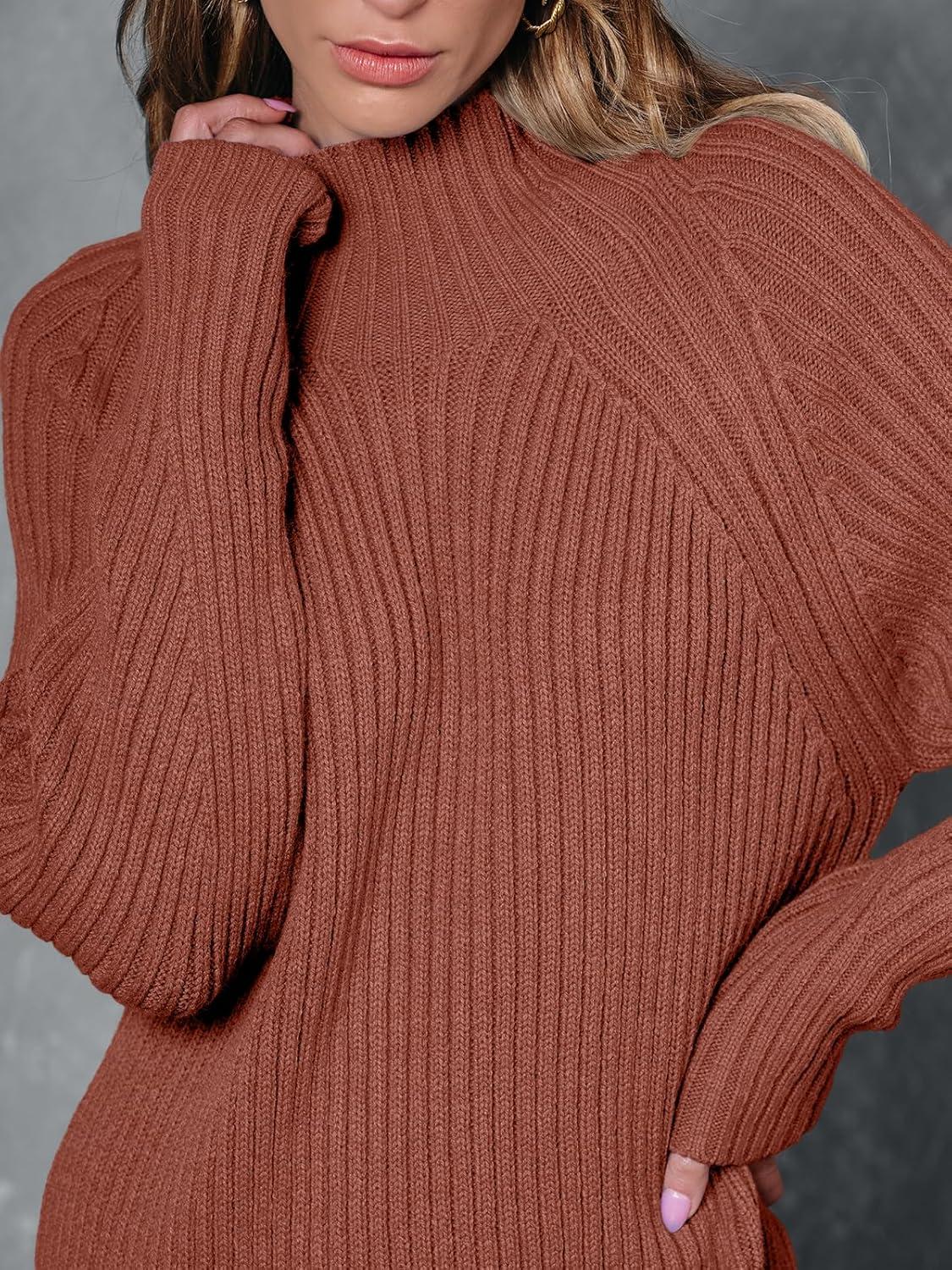LILLUSORY Sweater Dresses for Women 2025 Fall Fashion Mock Neck Long Lantern Sleeve Oversized Outfits Knit Tops Clothes(Brown)