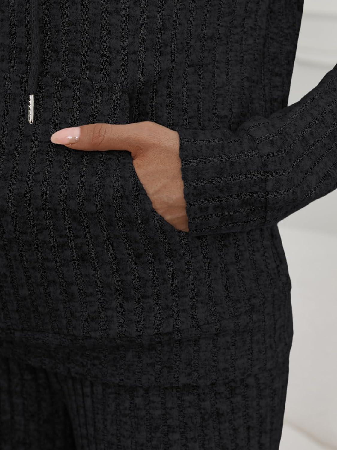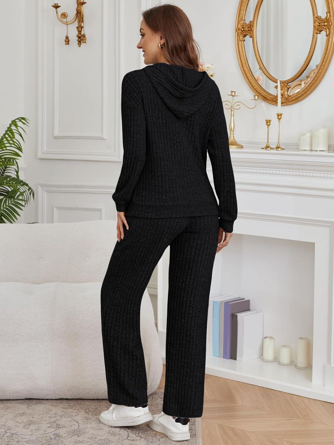 LILLUSORY Women 2 Piece Lounge Pajamas Sets Ribbed Knit Long Sleeve Sweater Hoodies Pants Matching Set 2025 Fall Outfits(Black)