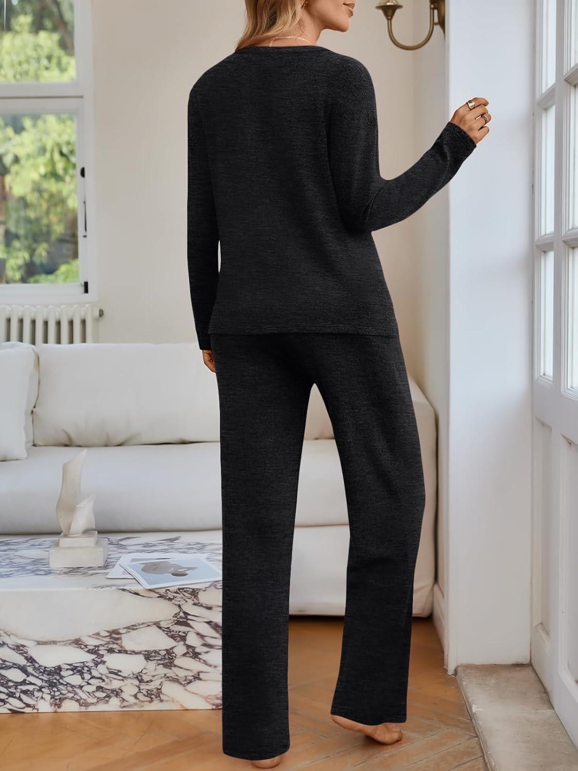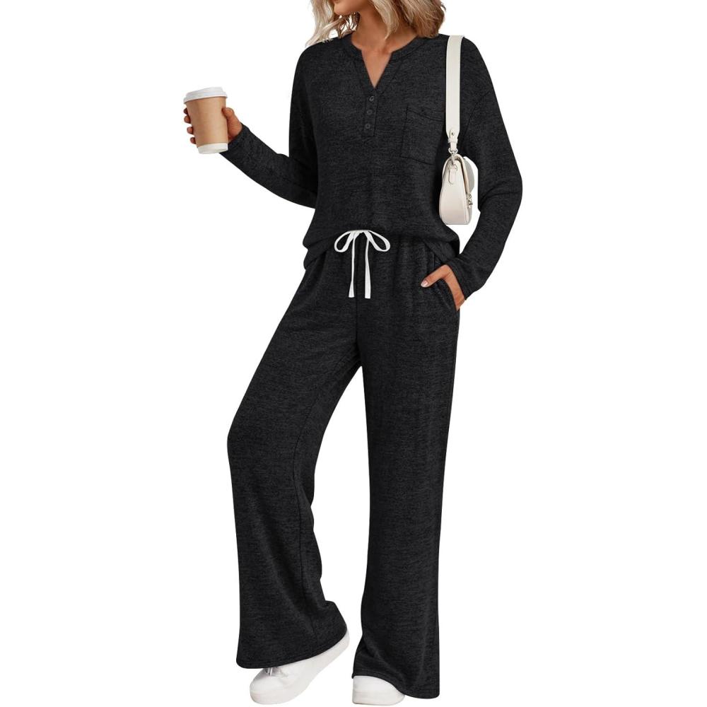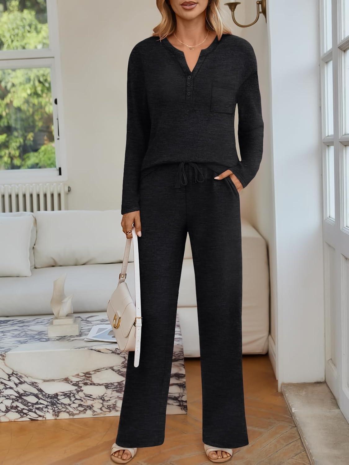 LILLUSORY Womens 2 Piece Lounge Sets Fall Outfits 2025 Sweatsuit Matching Cozy Soft Pjs Henley Neck Pajamas Pants Fashion(Black)