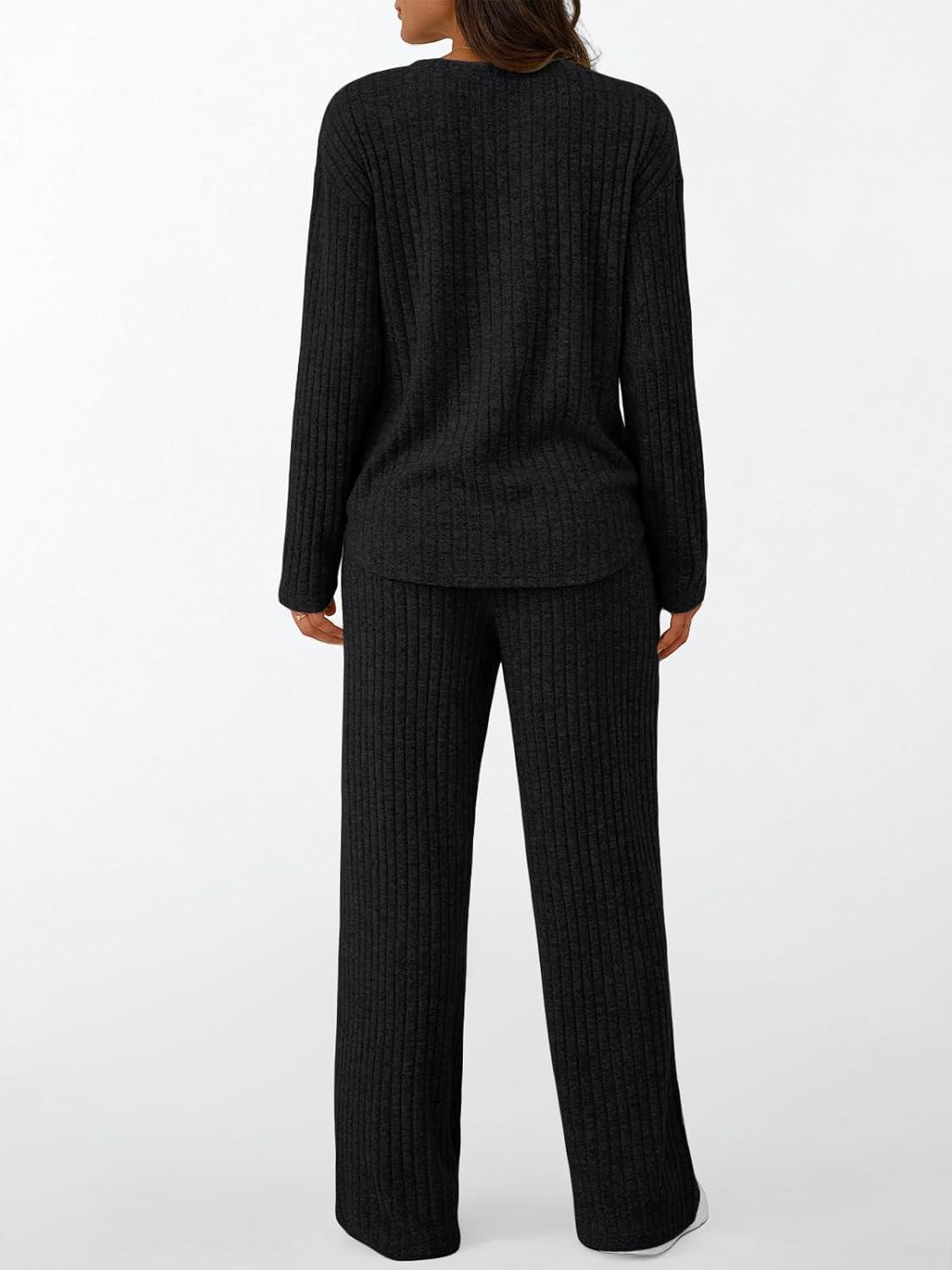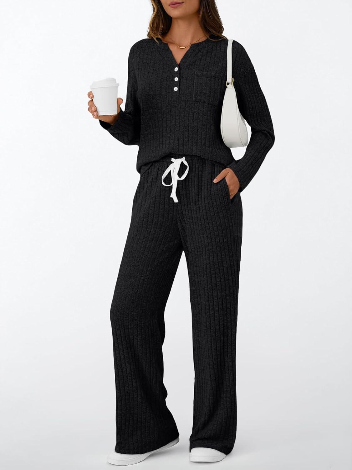 LILLUSORY Womens 2 Piece Lounge Sets Fall Outfits Henley Neck Sweater 2025 Matching Sweat Suits Comfy Pajamas Clothes Pockets(Black)