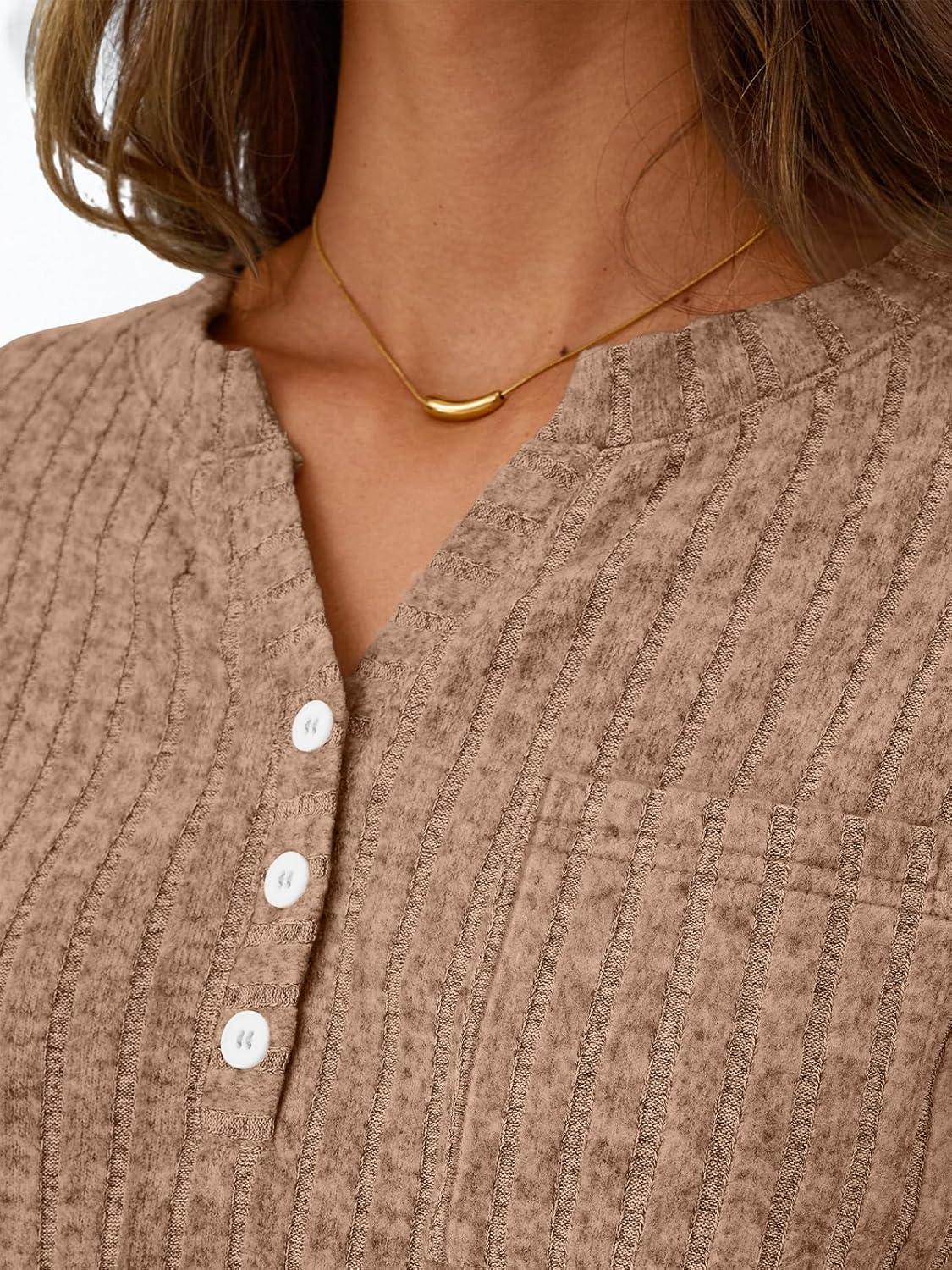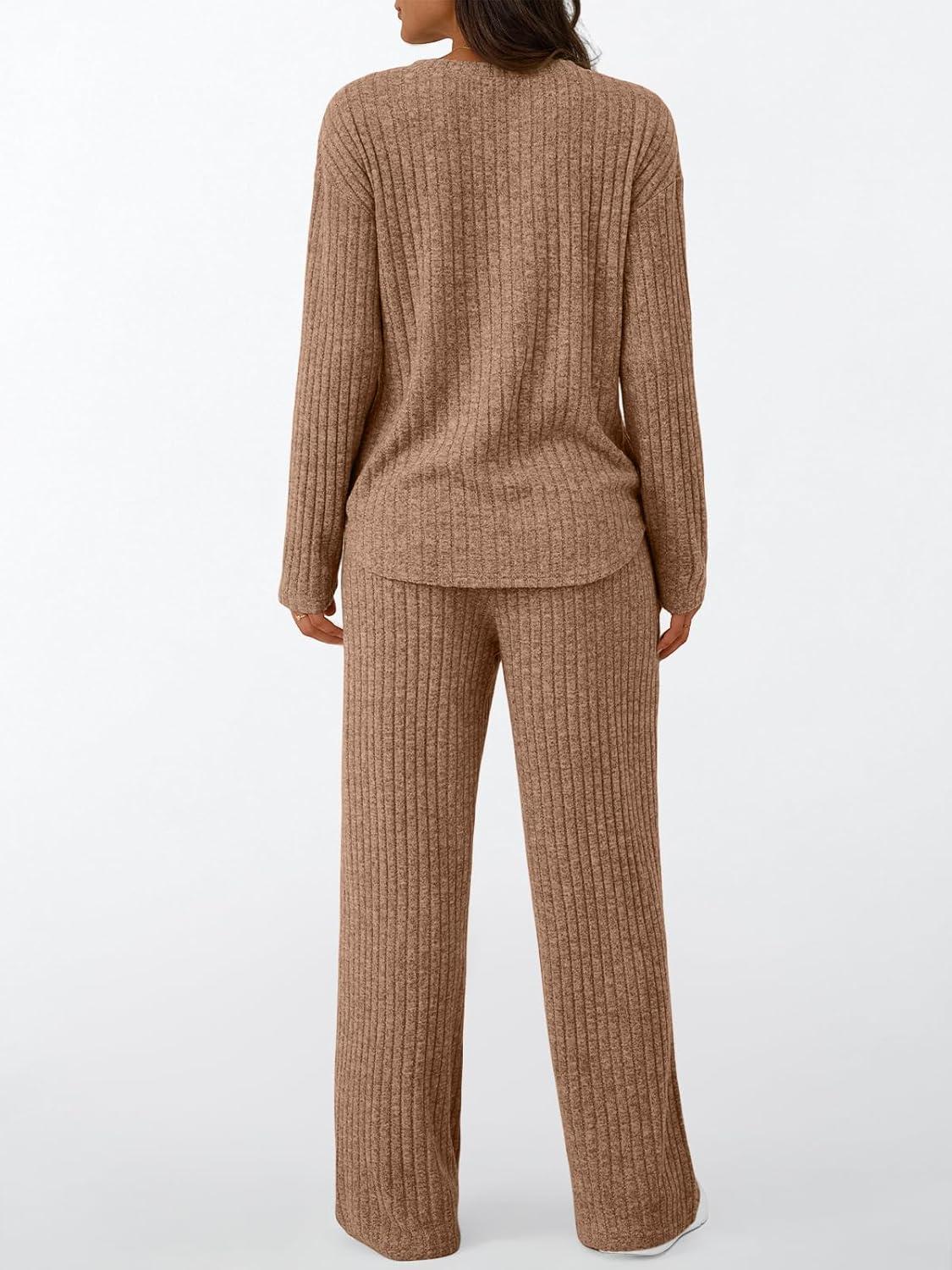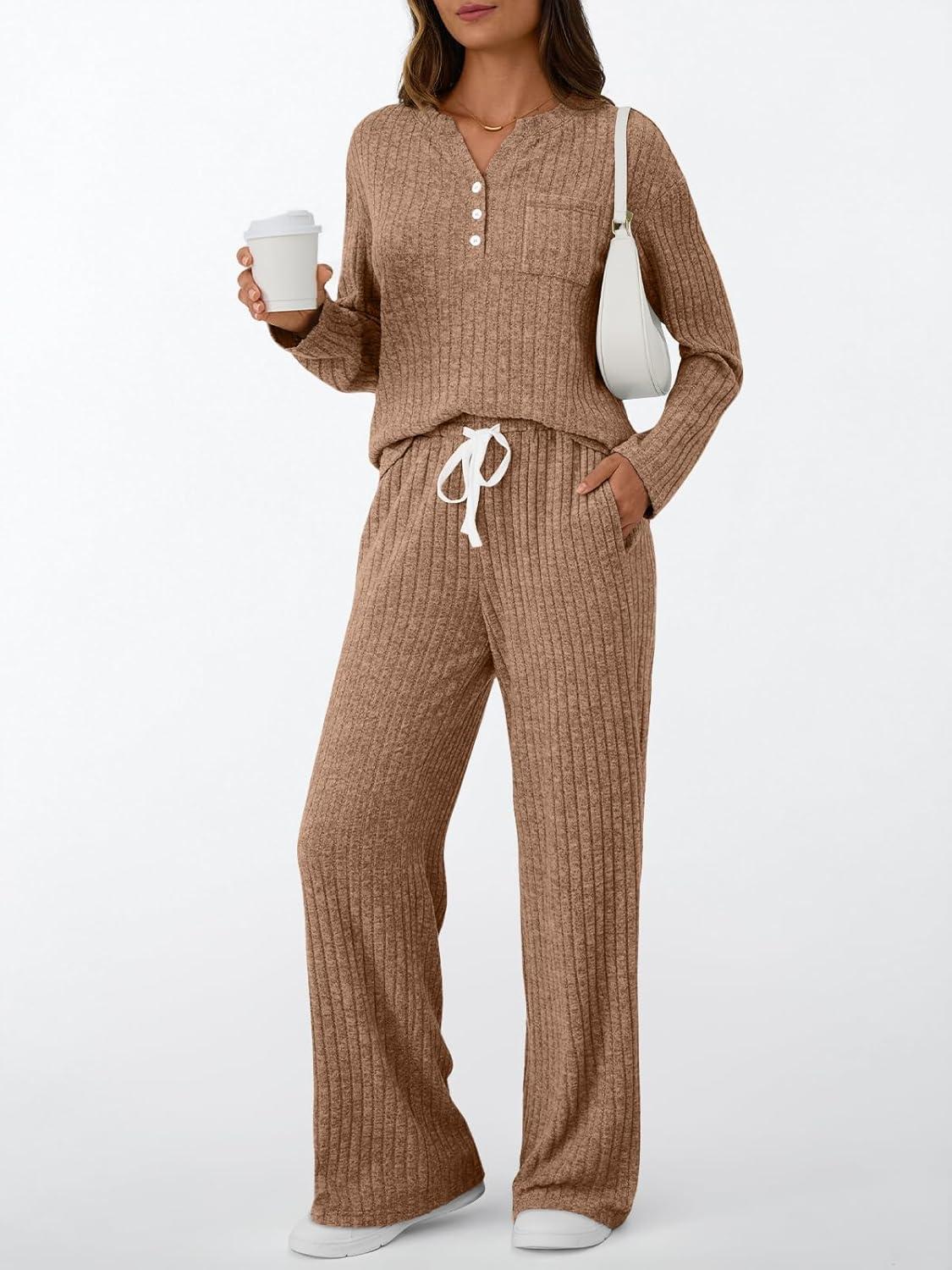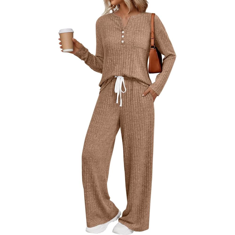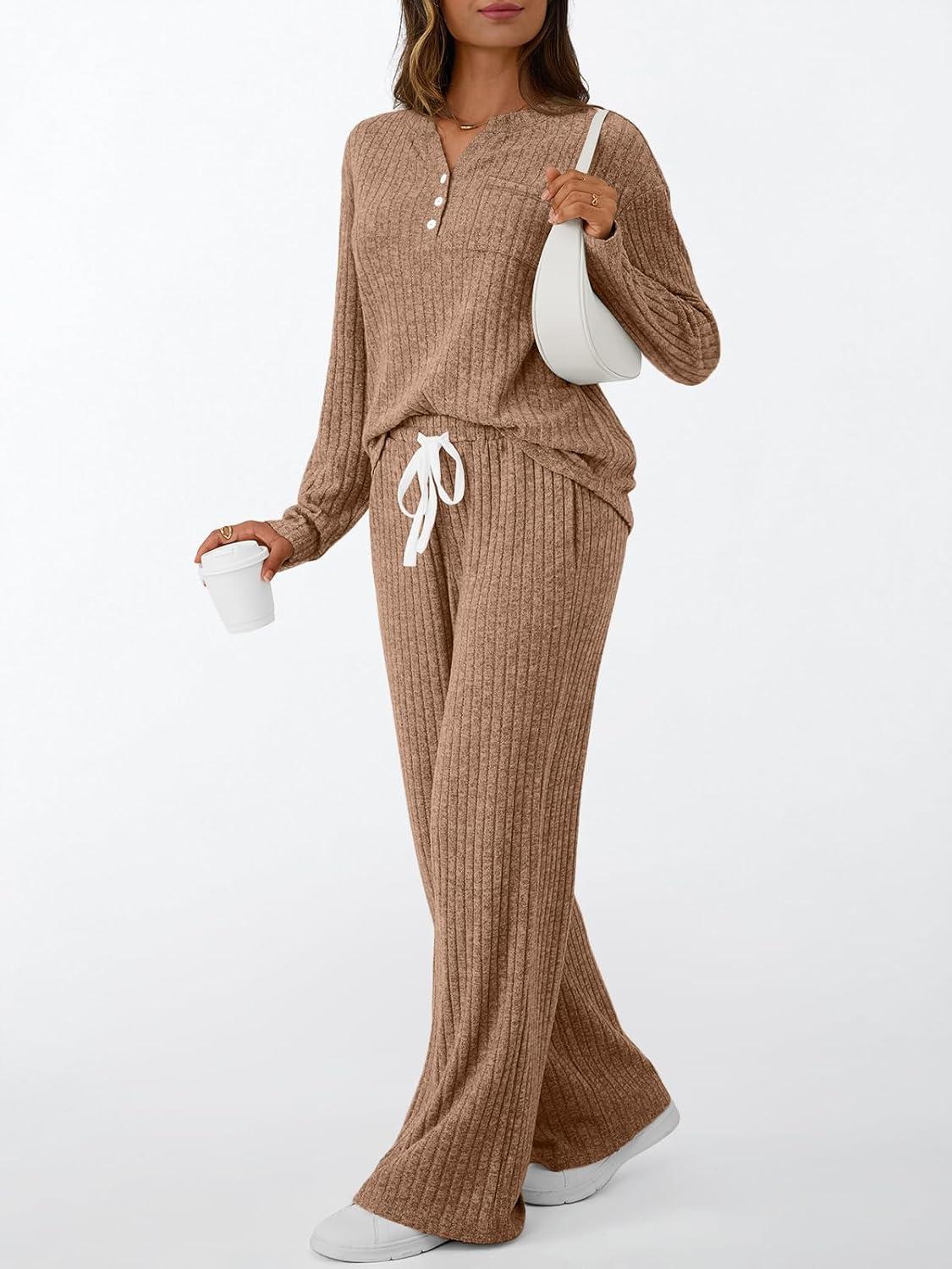 LILLUSORY Womens 2 Piece Lounge Sets Fall Outfits Henley Neck Sweater 2025 Matching Sweat Suits Comfy Pajamas Clothes Pockets(Khaki)