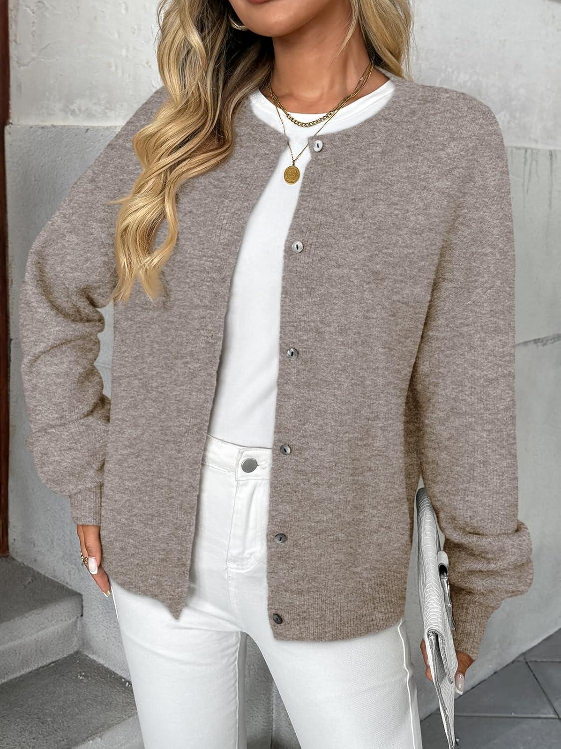 LILLUSORY Womens Crew Neck Button Down Cozy Cardigan Sweater Fall Outfits 2025(Khaki)