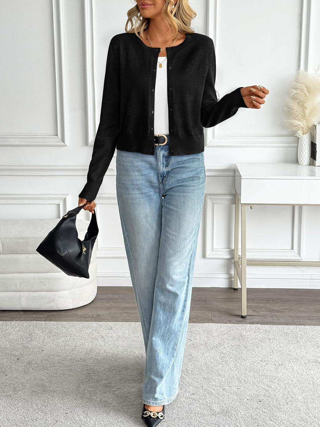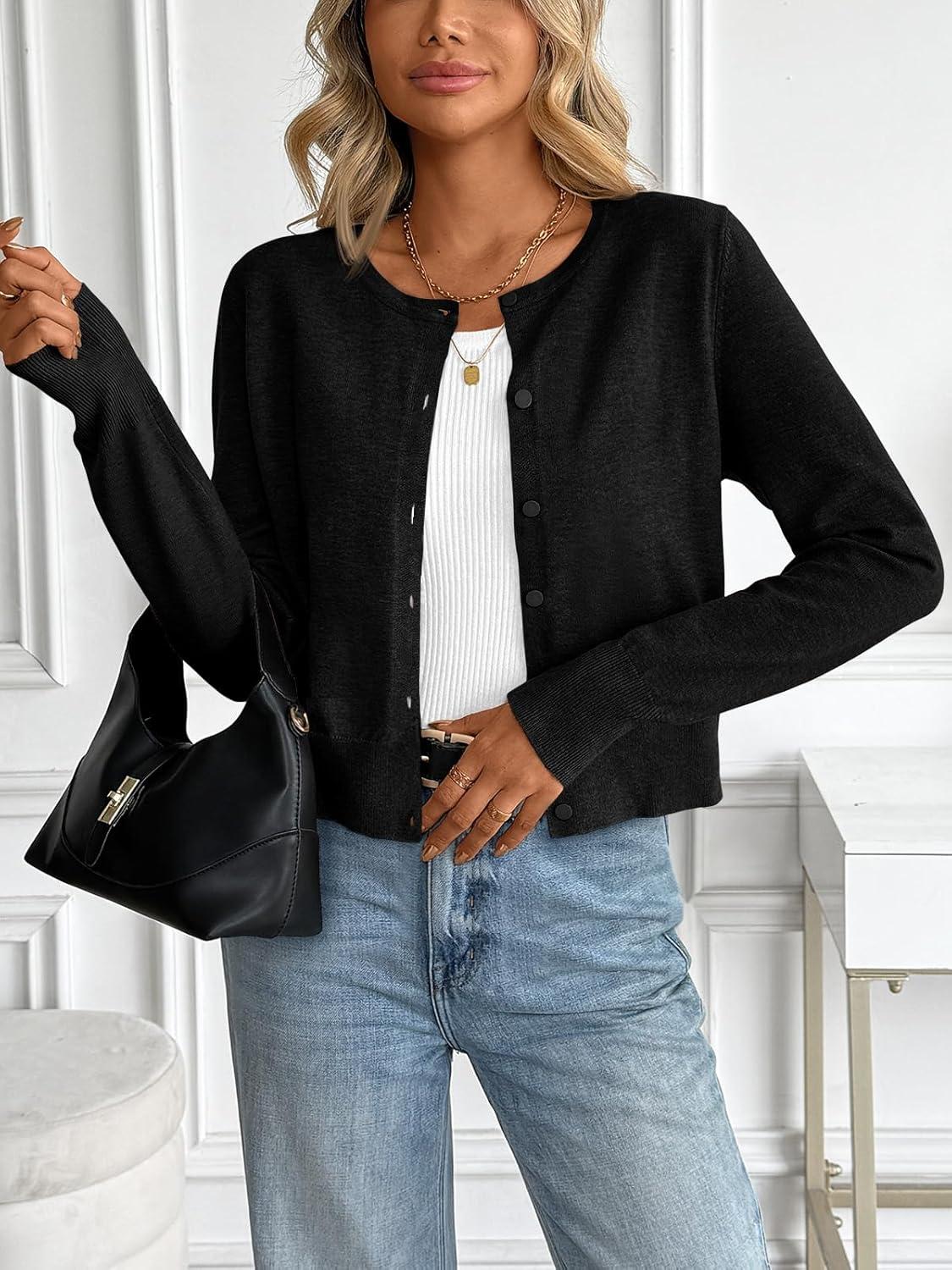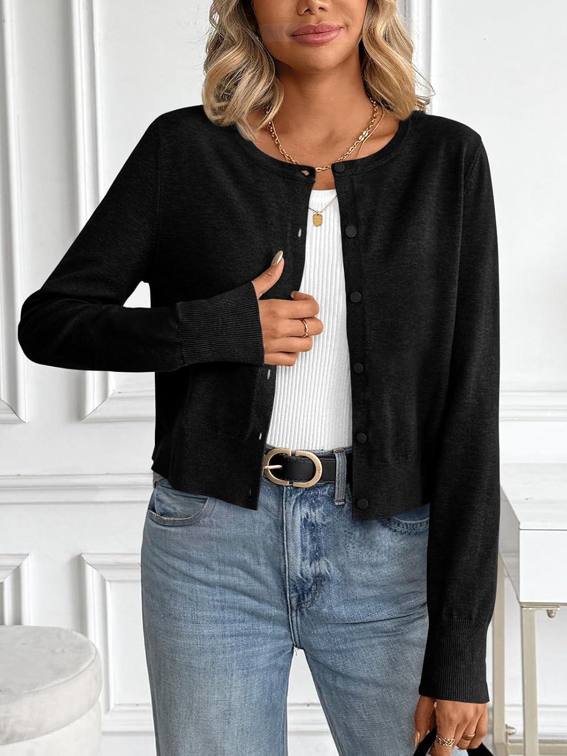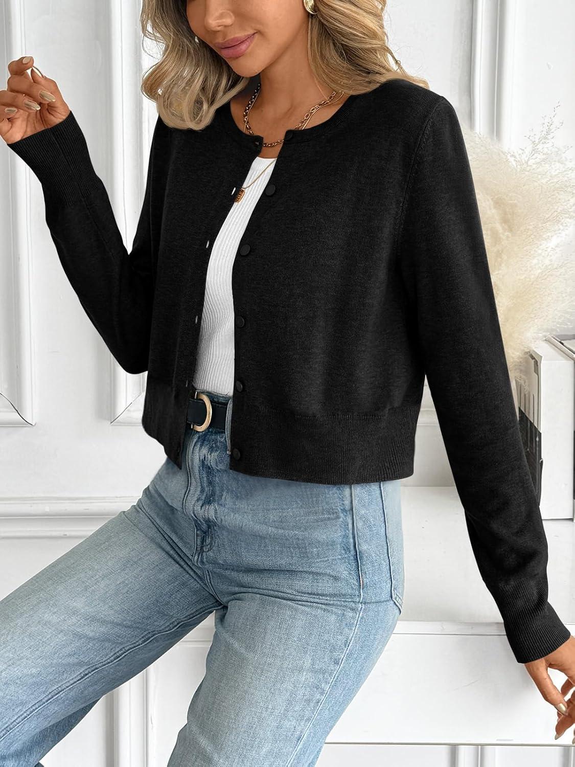 LILLUSORY Womens Cropped Cardigan Crew Neck Lightweight Crop Sweaters Fall Cute Button Down Knit Clothes 2025(Black)