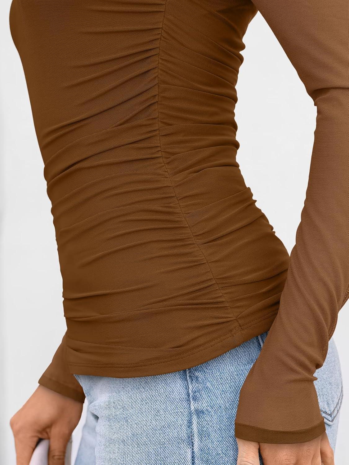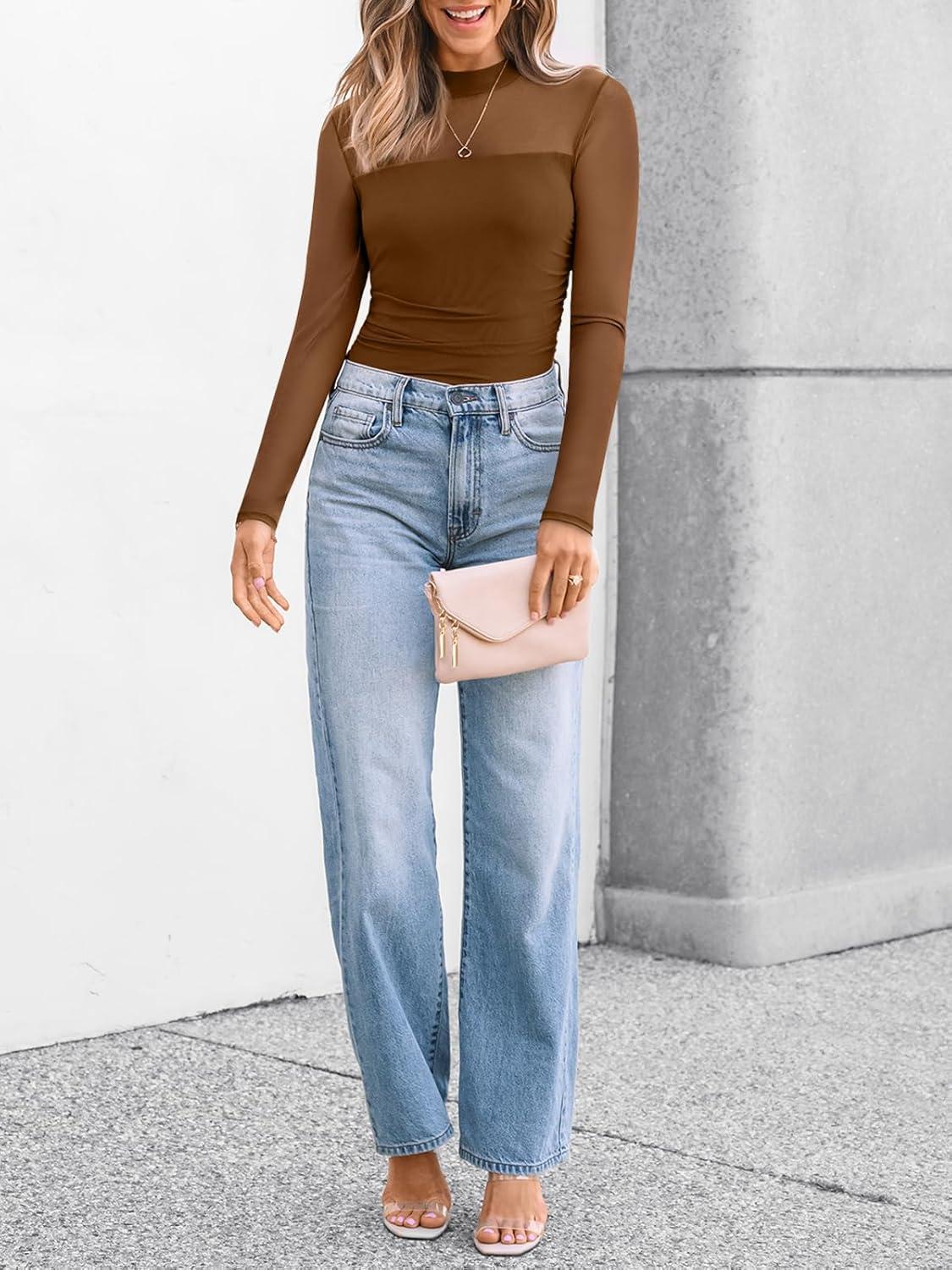 LILLUSORY Womens Long Sleeve Mesh Tops Mock Neck See Through Lace Shirts Sheer Going Out Sexy 2025 Fall Fashion Outfits(Brown)