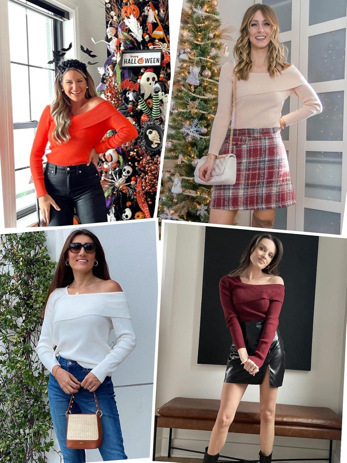 LILLUSORY Womens Off The Shoulder Sweaters Going Out Fall Sexy Knit Pullover Lightweight Asymmetrical Tops Clothes 2025(Caramel)