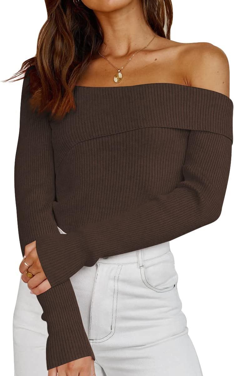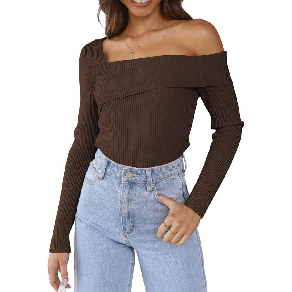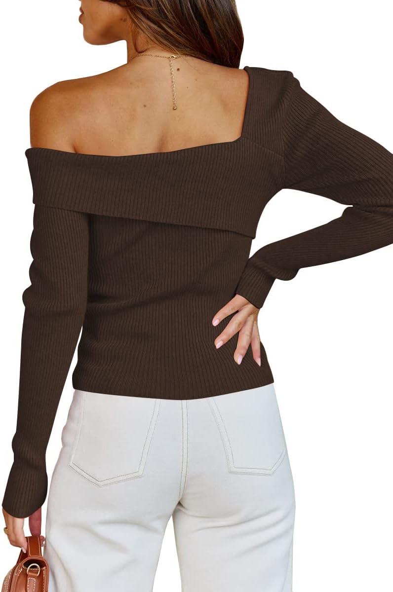 LILLUSORY Womens Off The Shoulder Sweaters Going Out Fall Sexy Knit Pullover Lightweight Asymmetrical Tops Clothes 2025(Coffee)