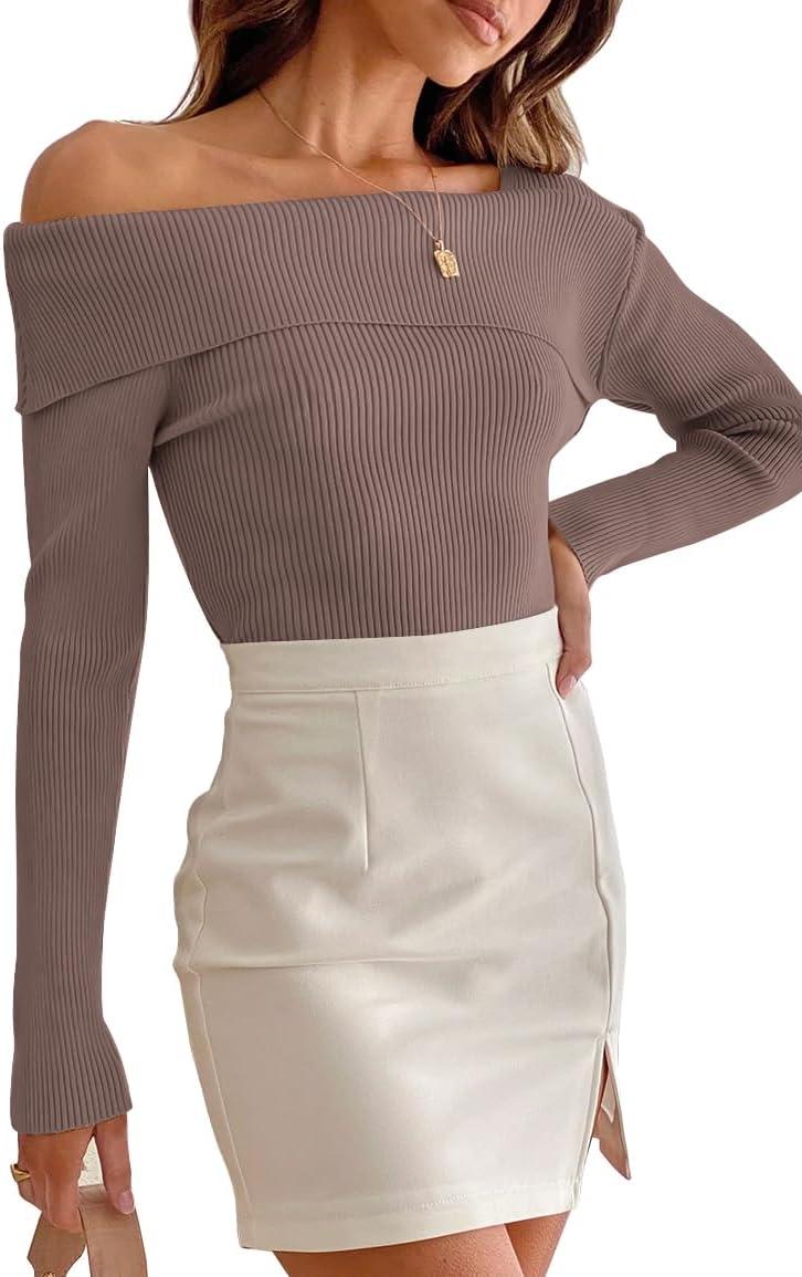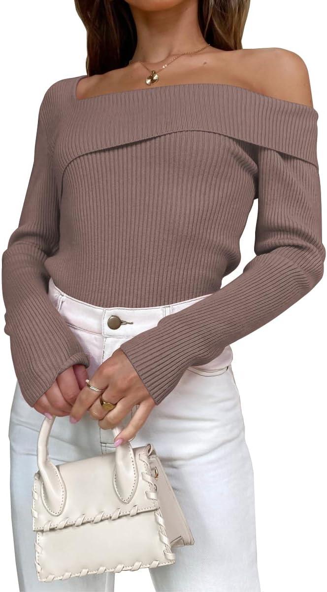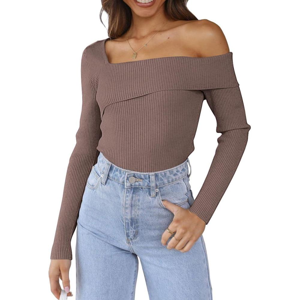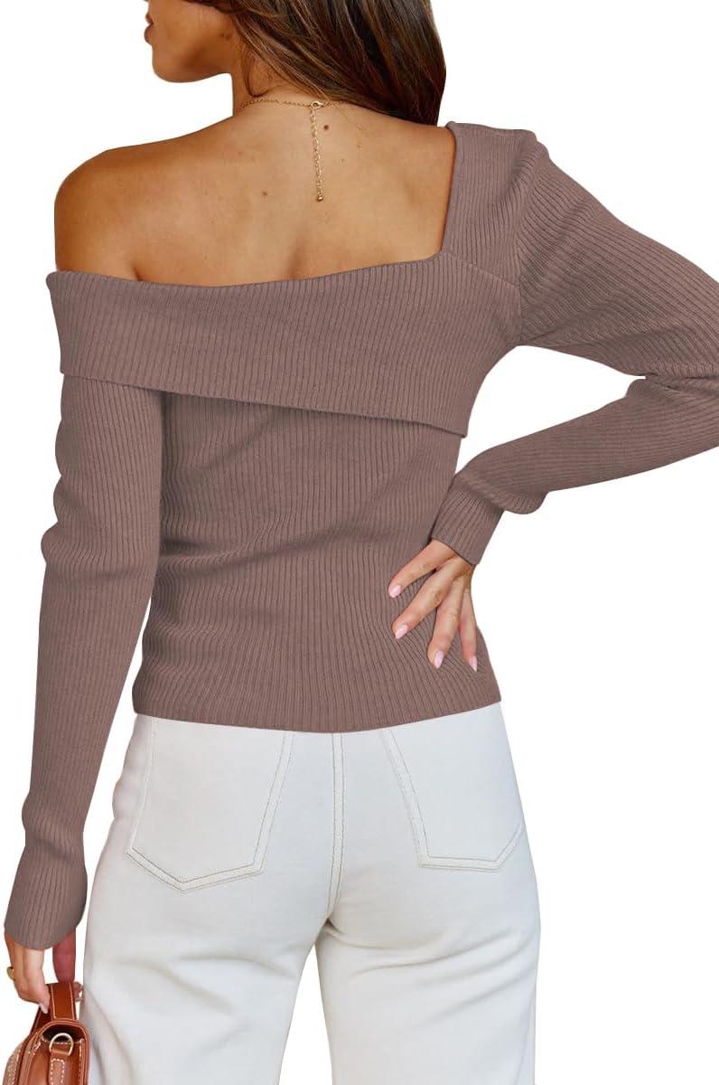 LILLUSORY Womens Off The Shoulder Sweaters Going Out Fall Sexy Knit Pullover Lightweight Asymmetrical Tops Clothes 2025(Nutmeg)