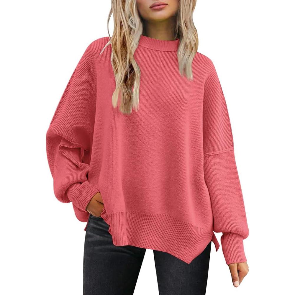 LILLUSORY Women’s Oversized Batwing Sweaters 2025 Fall Outfits Trendy Crewneck Knit Side Slit Fashion Pullover Tops(Bright Pink)
