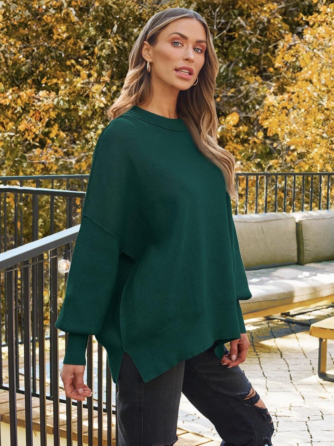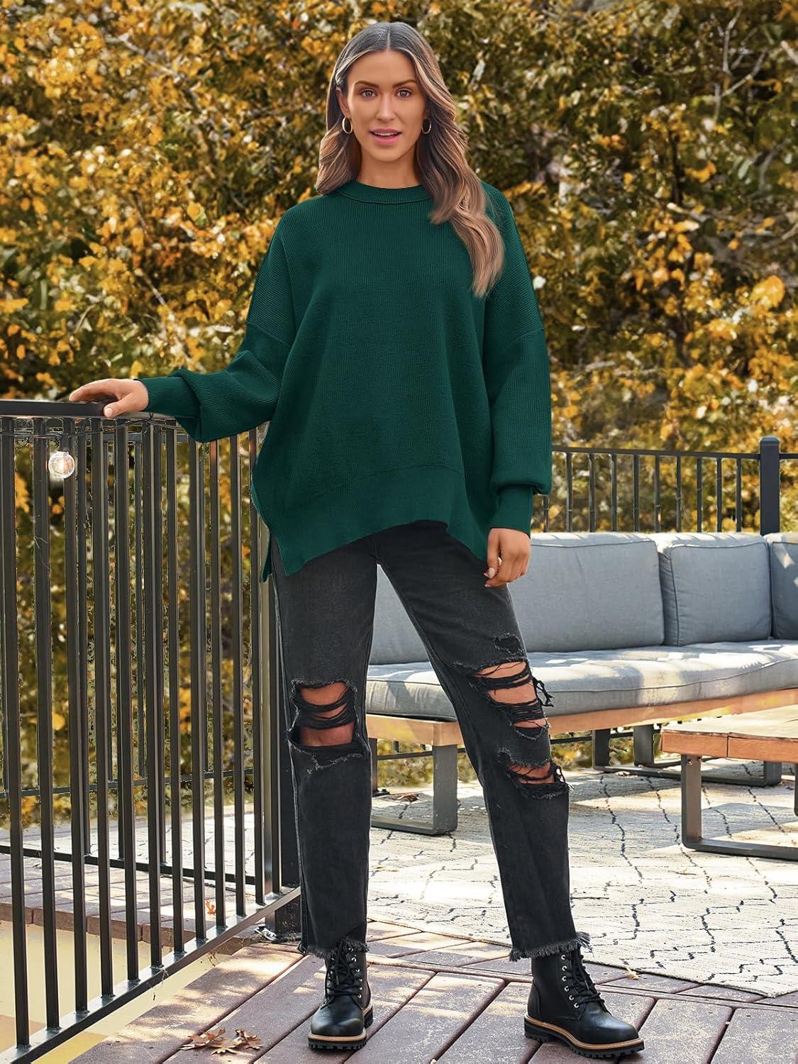 LILLUSORY Women’s Oversized Batwing Sweaters 2025 Fall Outfits Trendy Crewneck Knit Side Slit Fashion Pullover Tops(Deep Green)