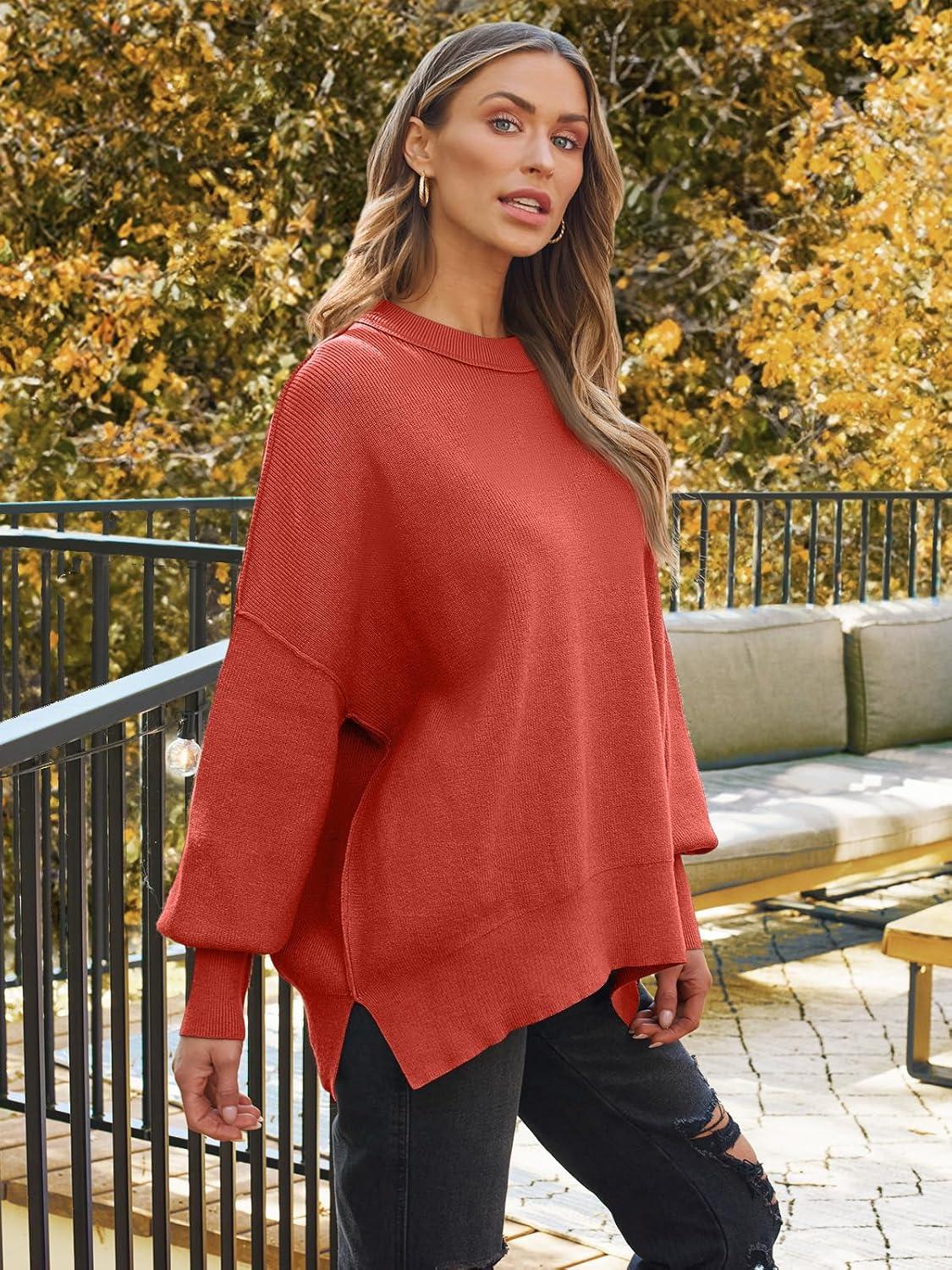 LILLUSORY Women’s Oversized Batwing Sweaters 2025 Fall Outfits Trendy Crewneck Knit Side Slit Fashion Pullover Tops(Watermelon Red)