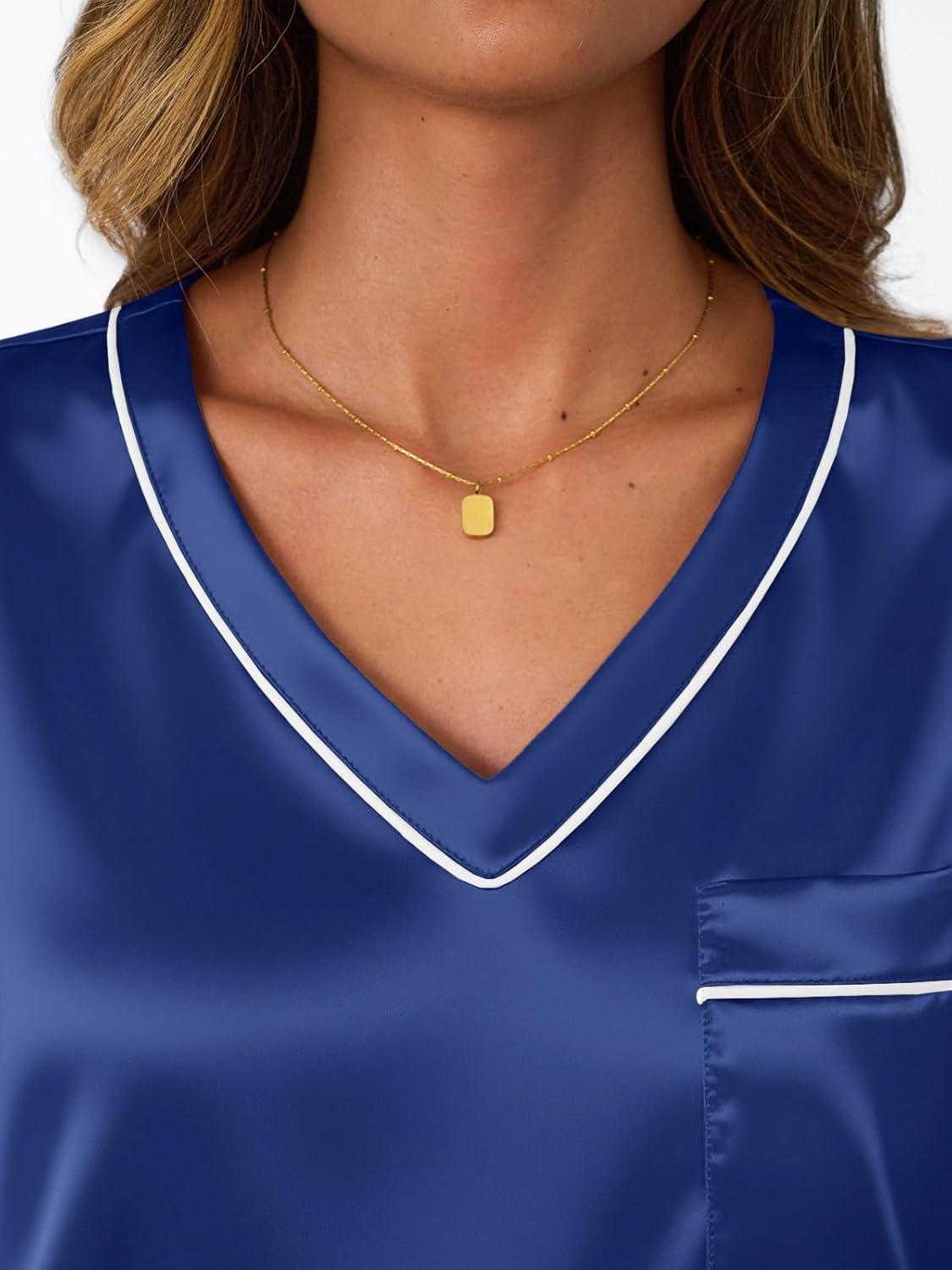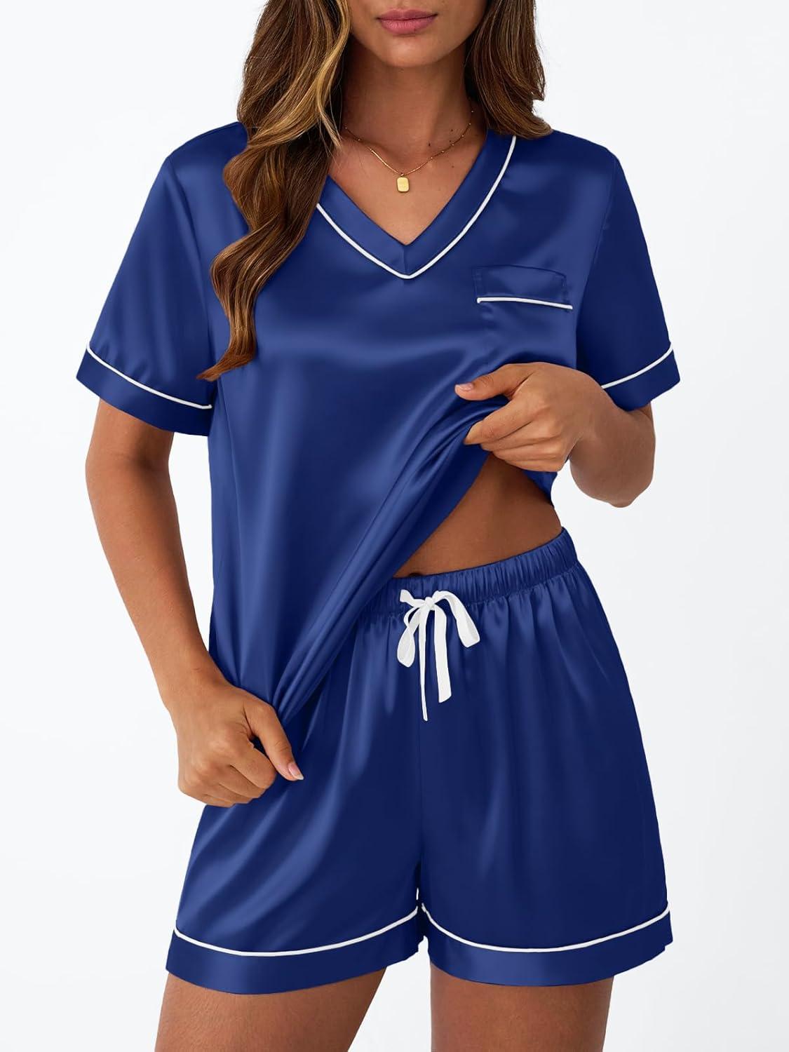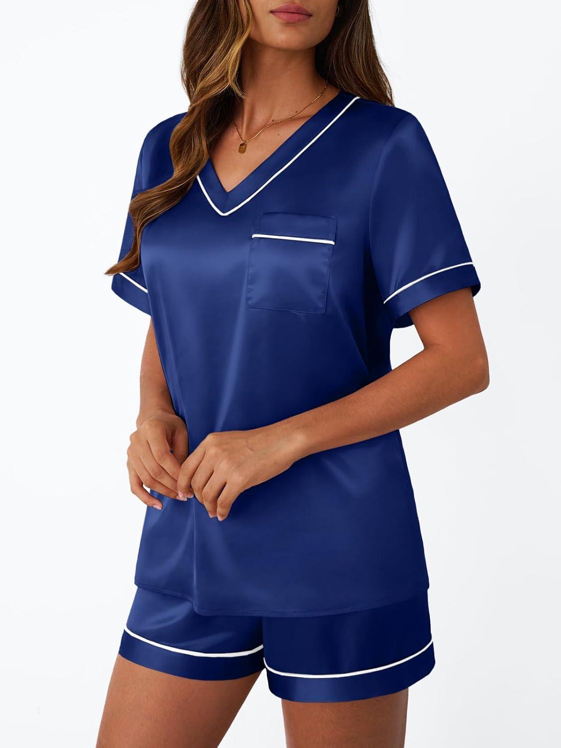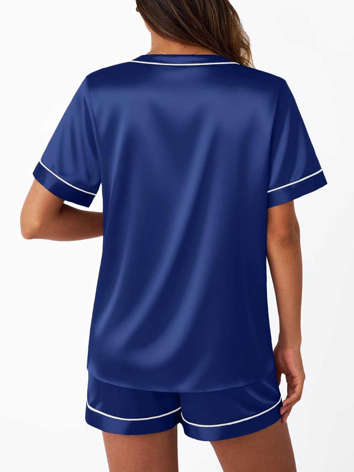 LILLUSORY Womens Silk Satin Pajama Set 2025 Short Sleeve Pjs Loungewear 2 Piece Sleepwear Matching Lounge Outfit(Navy Blue)
