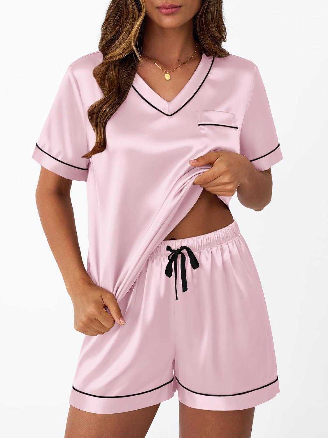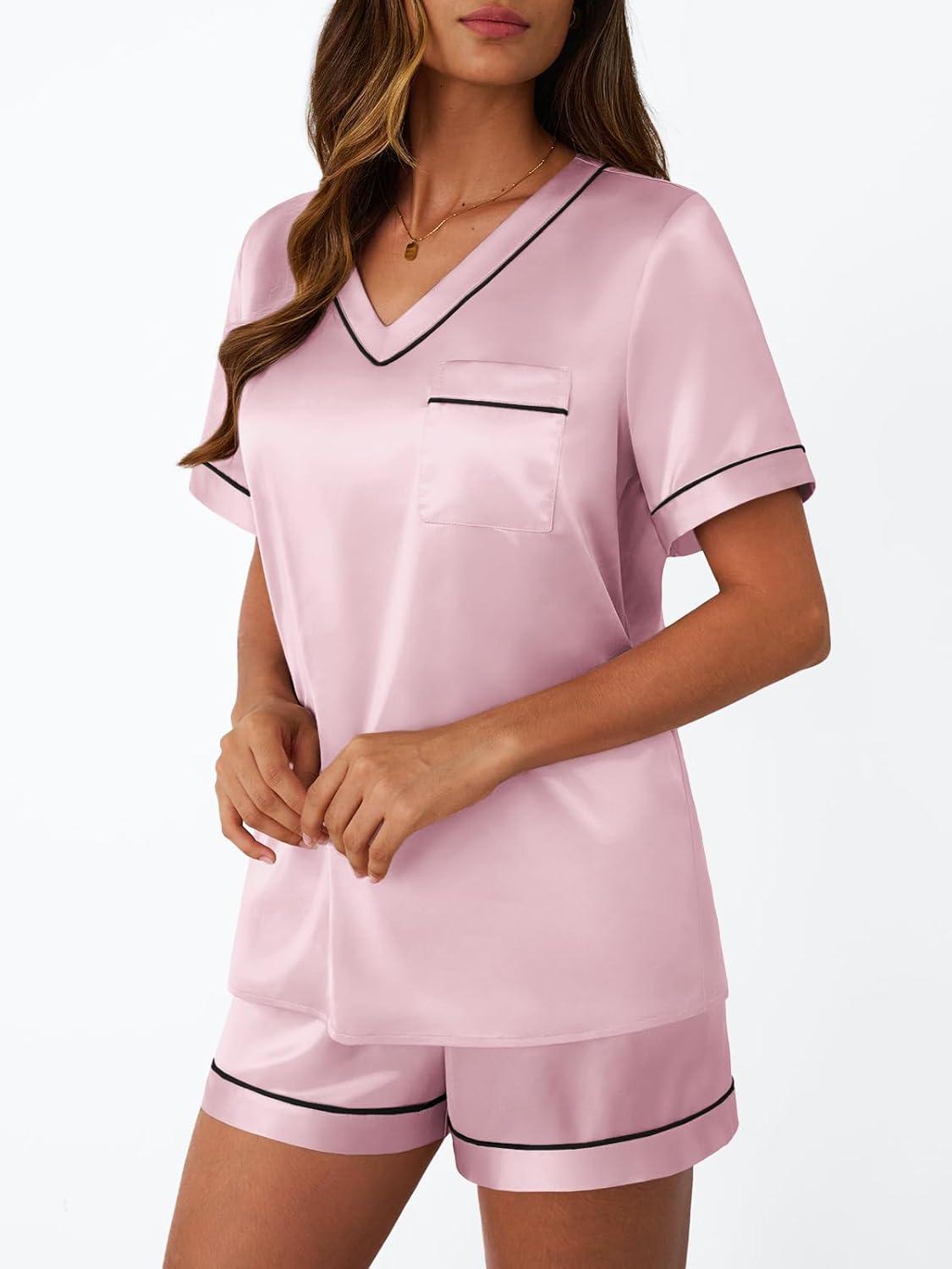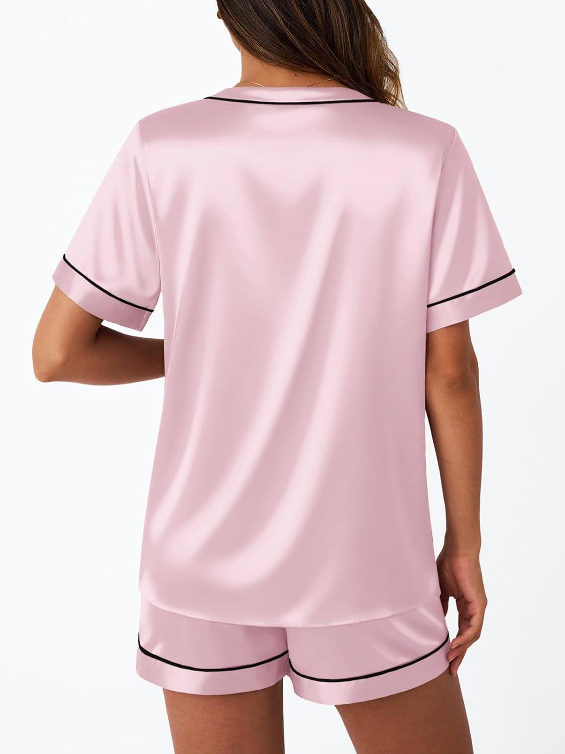 LILLUSORY Womens Silk Satin Pajama Set 2025 Short Sleeve Pjs Loungewear 2 Piece Sleepwear Matching Lounge Outfit(Pink)