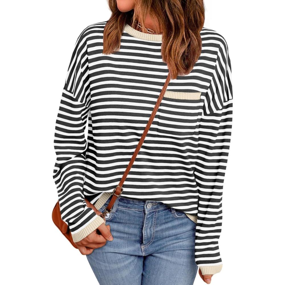 LILLUSORY Womens Striped Soft Knit Pullover Sweater Loose Fit Shirts with Chest Pocket(Apricot-striped Grey)