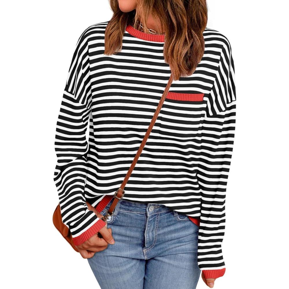 LILLUSORY Womens Striped Soft Knit Pullover Sweater Loose Fit Shirts with Chest Pocket(Red-striped Black)