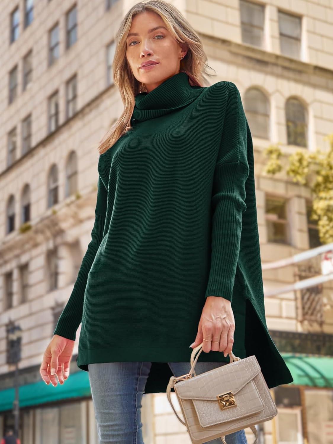 LILLUSORY Women’s Turtleneck Oversized Sweaters Long Batwing Sleeve Spilt Hem Tunic Pullover Knit Tops(Forest Green)