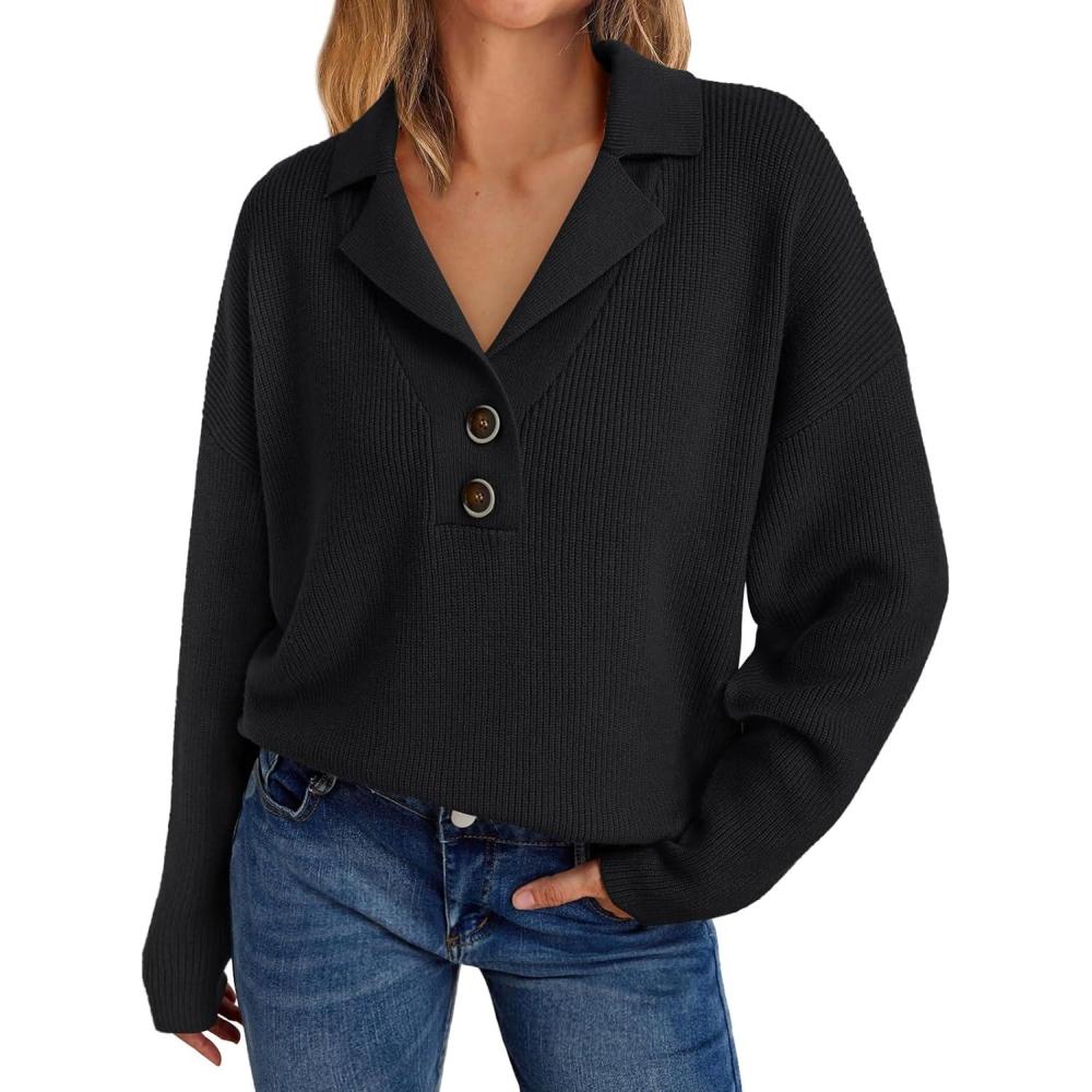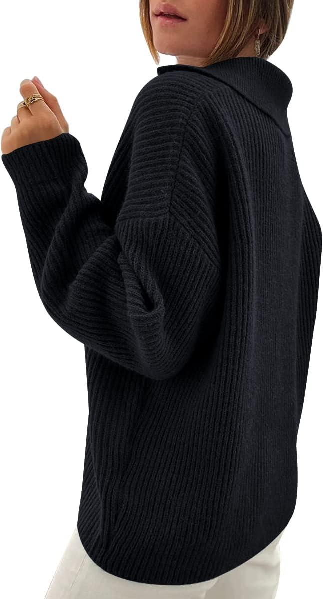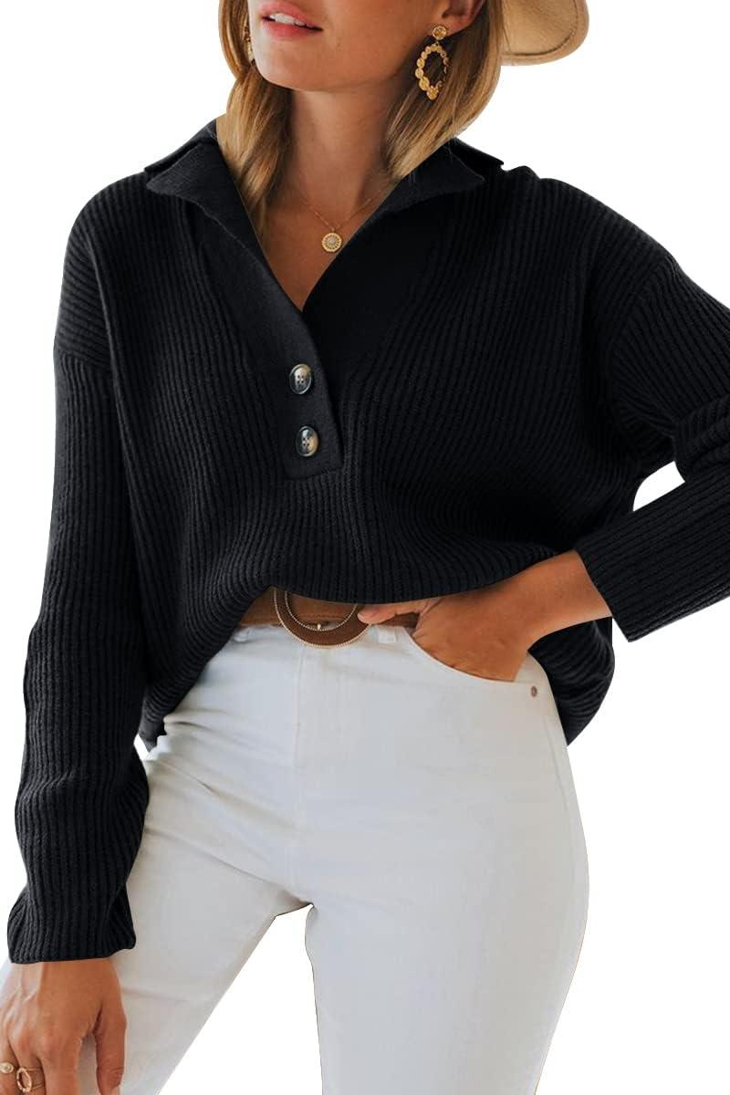 LILLUSORY Womens V Neck Pullover Sweaters Casual Cable Knit Chunky Warm Cute Tops with Collar Polo(Black)