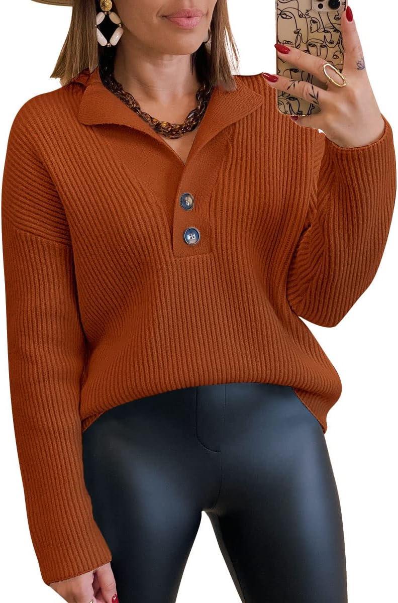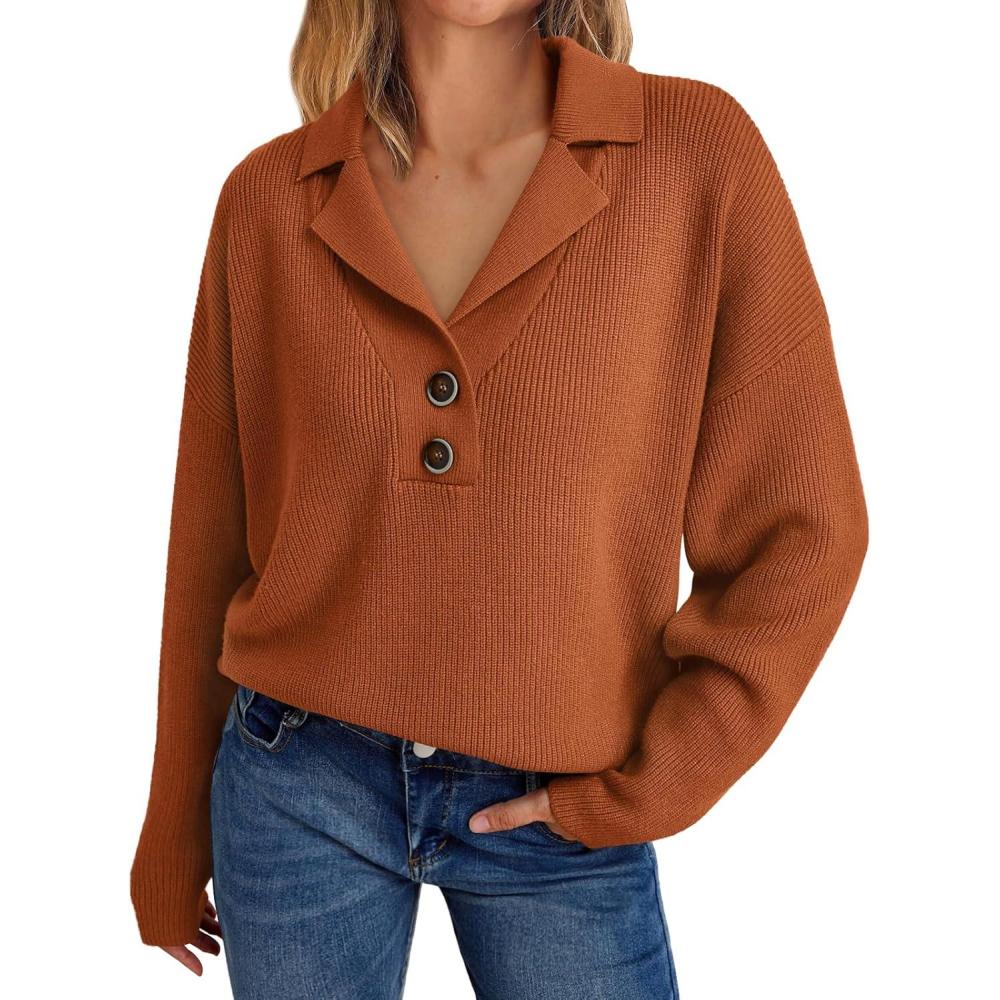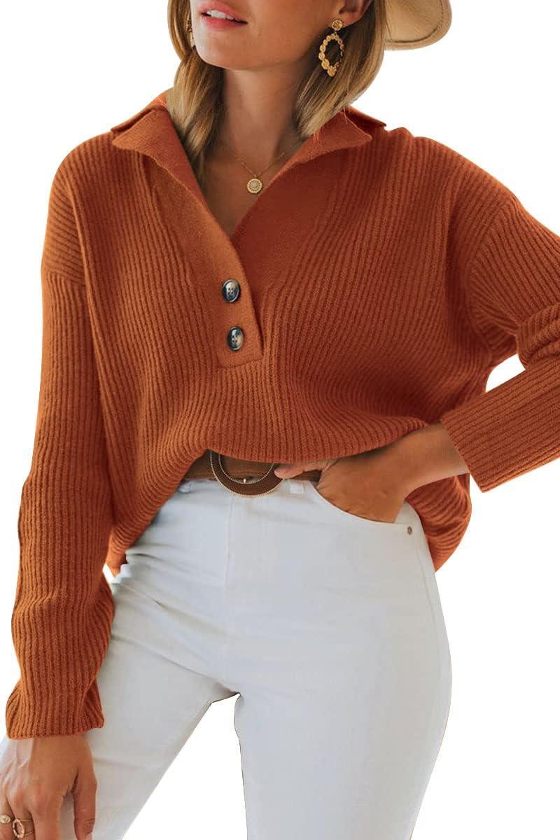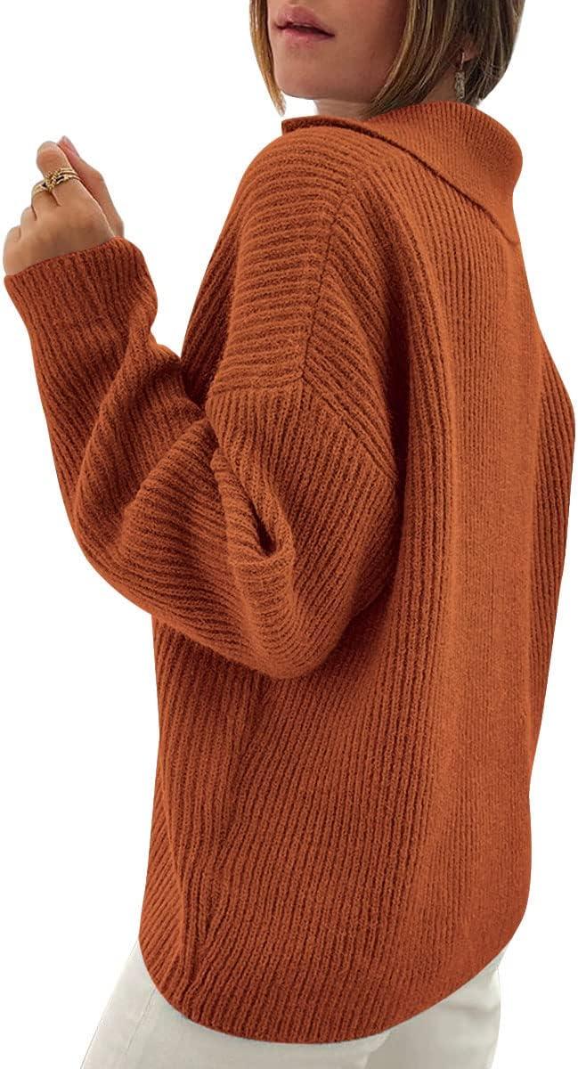 LILLUSORY Womens V Neck Pullover Sweaters Casual Cable Knit Chunky Warm Cute Tops with Collar Polo(Rust Red)